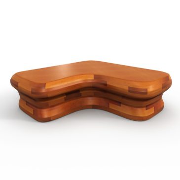 Using beautifully rendered strips of red cedar, the artist has transformed a square table into a flowing form. The layered aesthetic give this attractive and functional design great appeal. It would fit handsomely into a large range of interiors.
